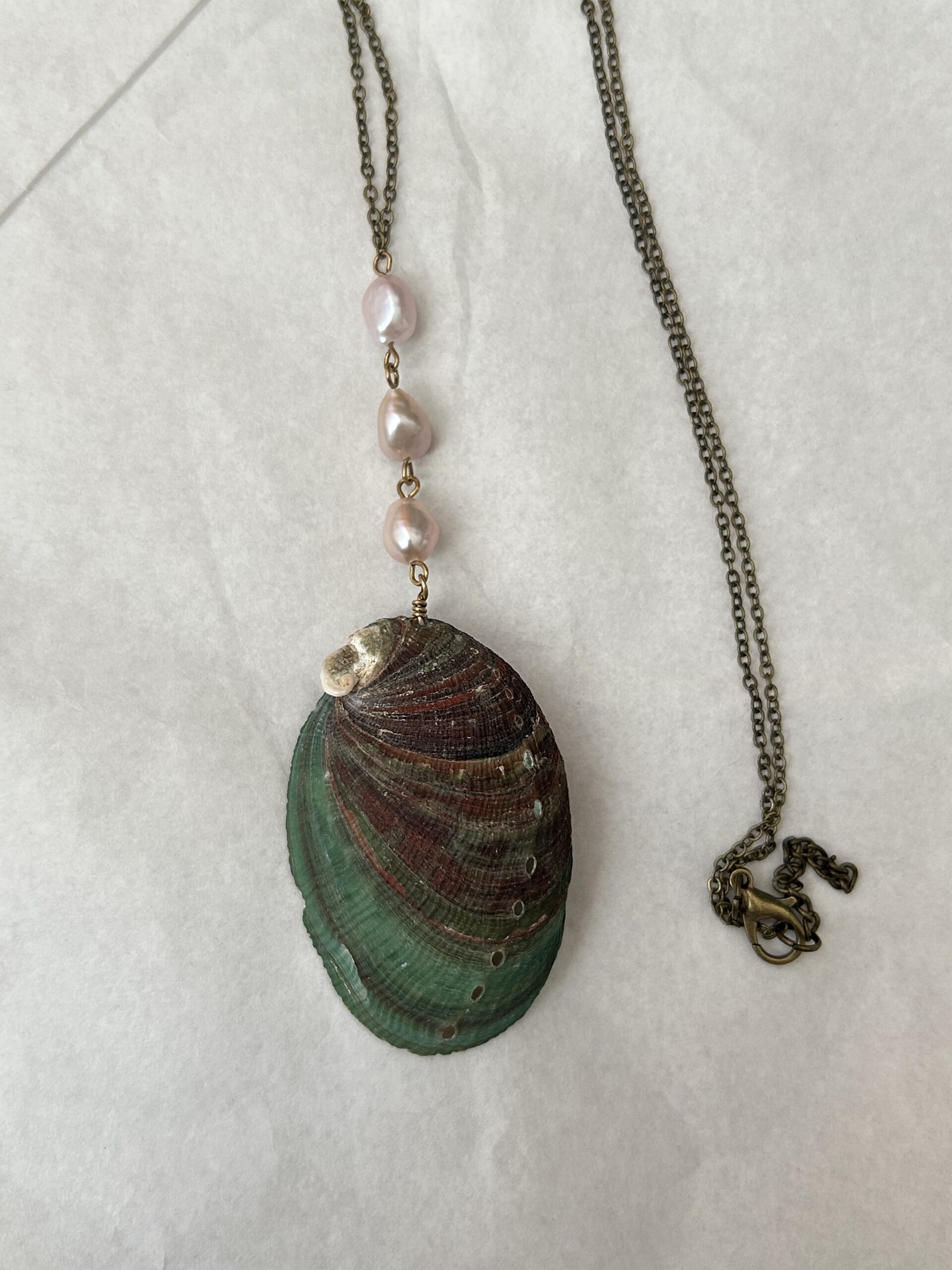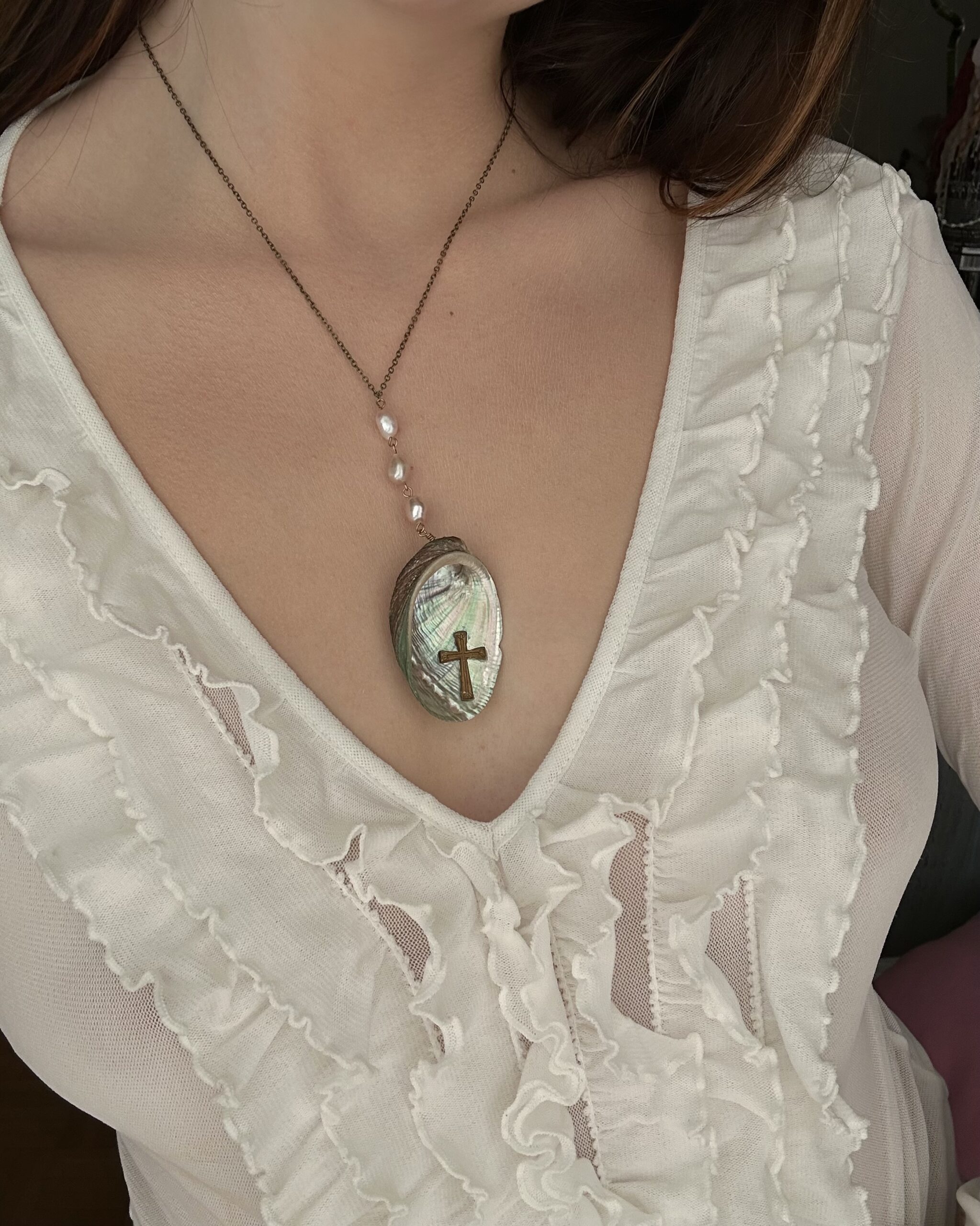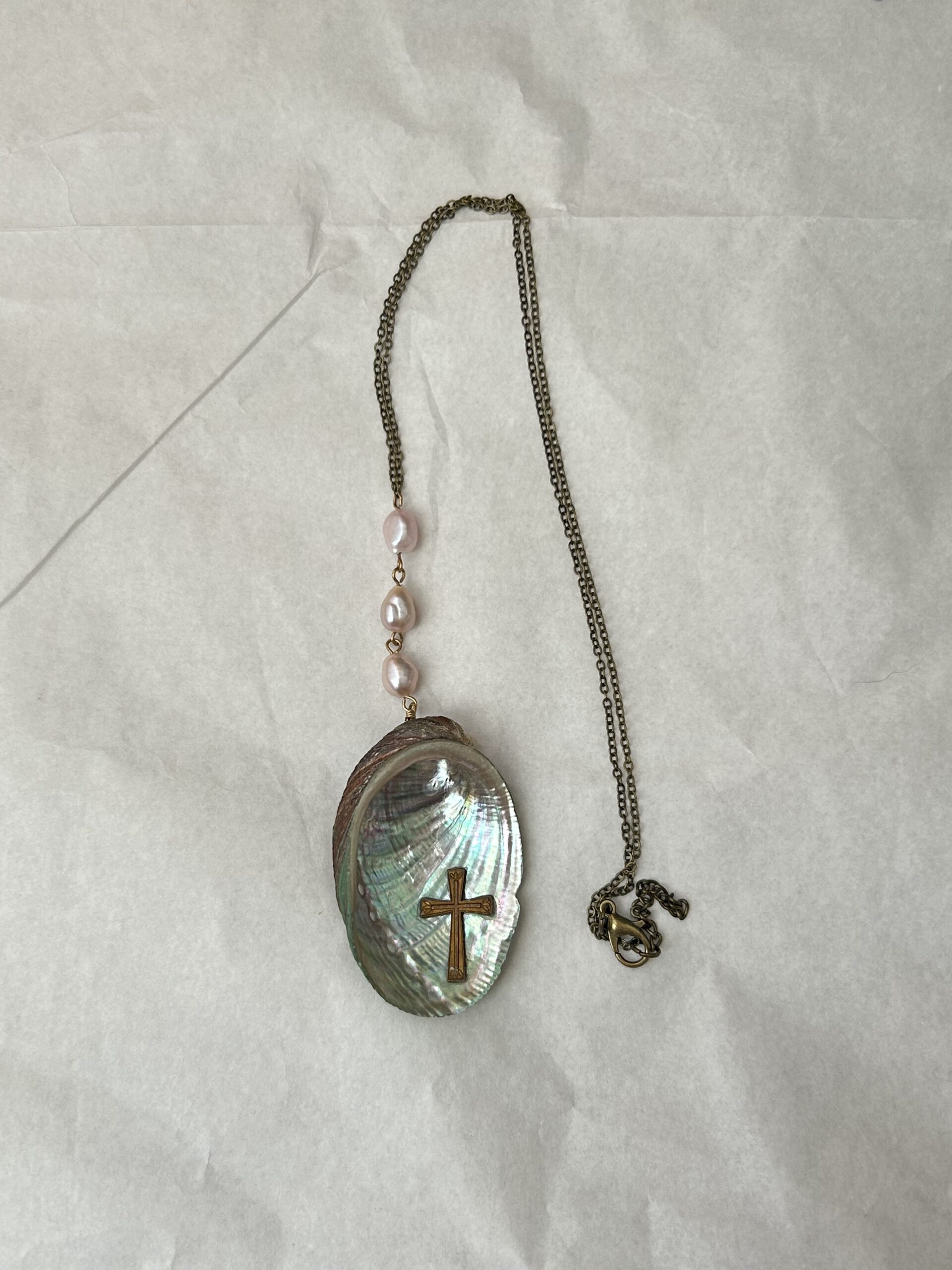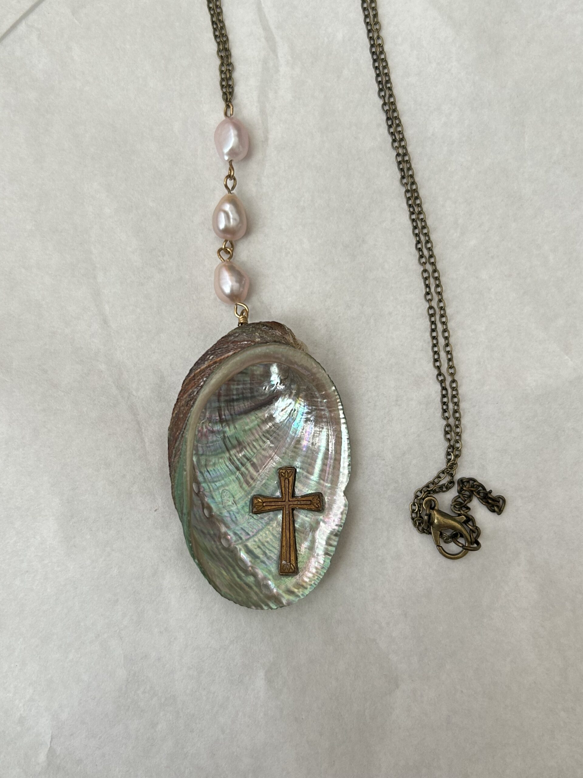Real abalone shell, real freshwater pearls, vintage cross. Each product may vary slightly due to the use of natural shells